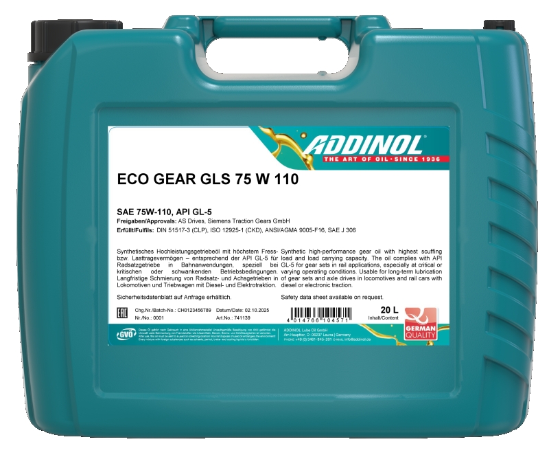 ADDINOL Eco Gear GLS 75 W 90 и GLS 75 W 110 — это не содержащие силиконов синтетические трансмиссионные масла класса API GL-5, обладающие высочайшей несущей способностью, способствующей уменьшению задиров. Предназначены для применения в осевых редукторах железнодорожного подвижного состава, в особенности функционирующих в критических или непостоянных условиях эксплуатации.